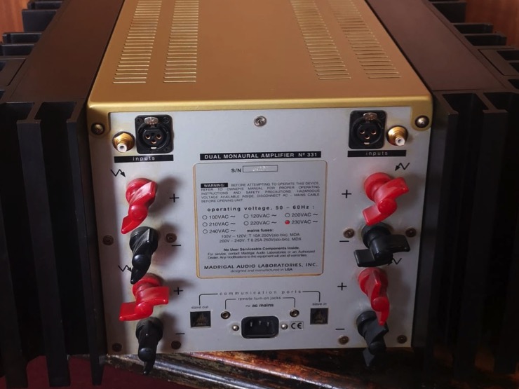 Reduced in July 2023. Was: €2.000. Solid-state stereo amplifier. Extensive cosmetic alterations, internal structural changes, and new circuit designs make it quite different from the No.27 and No.27.5 models that preceded it. The No.331 is a dual-mono design with completely independent power supplies, voltage, and current gain-stages packaged in one compact chassis; two toroidal transformers (801 VA), one for each channel, oriented to cancel stray magnetic fields; a soft-clipping circuit to reduce the subjective effects of amplifier overload and clipping; and all voltage gain-stages independently regulated. The design of the '331's signal circuitry is based on the No.33 Reference amplifier. It features a balanced signal path and three voltage gain-stages. An important aspect of the design was the implementation of a new sliding-bias output-stage topology which Madrigal calls "Adaptive Biasing." An amplifier with Great clarity, transparency, power and super control. Specifications: Rated output power, 20Hz–20kHz, with no more than 0.5% THD (FTC): 100Wpc minimum continuous into 8 ohms (20dBW); 200Wpc minimum continuous into 4 ohms (20dBW); 400Wpc continuous into 2 ohms (20dBW). Peak output voltage at rated line voltage: 48V into 8 ohms. Frequency response: 20Hz–20kHz ±1dB. S/N ratio (main output): <–80dB (ref. 1W). Input impedance: 100k ohms balanced, 50k ohms single-ended. Voltage gain: 26.8dB. Input sensitivity (for 2.8V output): 130mV. Input sensitivity (for full output): 1.3V. Output impedance: !x0.05 ohms, 20Hz–20kHz. Damping factor: >800, 20Hz–20kHz into 8 ohms. (2) Inputs: 1 x balanced (XLR) and 1 x unbalanced (RCA). Two pairs of speaker binding posts. Remarks: a) No original packaging; b) three dents on the top of the right heat sink and one mark on the top of the left rear heat sink.