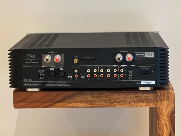 Musical Fidelity M6si integrated amplifier. Internally, the M6si is configured as 2 independent monobloc power amps with a separate pre amp. It is, in fact, a pre amp with 2 monobloc power amps that just happen to share the same casework. The M6 combination of high power, high current and extraordinary stability means that it can drive any loudspeaker with ease. Specifications: Power Output: 220 Watts into 8 ohms per channel. THD (+ noise): <0.007 % typical 20Hz - 20 kHz. Signal to Noise Ratio: >107dB ‘A’ – weighted. Frequency Response: +0, –0.1dB, 10Hz to 20 kHz. (6) Inputs: 1 x balanced (XLR), 4 x unbalanced (RCA), 1 x USB type ‘B’ connector - asynchronous data stream at up to 24-bit/96kHz and 1 x switchable phono (MM/MC). Phono Input: Sensitivity: 3mV nominal (MM), 0.4mV nominal (MC), Signal / noise ratio: >84dB ‘A’-weighted, Input impedance: 47k Ohms (MM and MC), Frequency response: RIAA/IEC ±0.5dB 20Hz-20kHz. (2) Outputs: 1 x unbalanced Fixed (RCA) and 1 x Variable, preamp output (RCA).