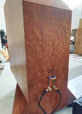 Reduced in February 2024. One-way full-range speaker working in a back-loaded horn. The horn is used to backload the DDD and it enables the driver to operate essentially full range, the bass knee frequency occurring at 40 Hz. The resulting enclosure is admittedly rather large and complex, but it gives to The Unicorn a unique degree of coherence possible only with a single element speaker system. No transition is perceptible between the direct radiation of the DDD from the midbass on up and the horn loading imposed on the lowest frequencies, rather the impression is of a single driver of amazing quickness and impressive output capabilities at all frequencies. The Unicorn is essentially a crossoverless design, the transition from direct to horn radiation being accomplished through passive acoustical devices, but a contouring network is used to smooth the frequency response through the transition region. Specifications: Impedance: 4 Ohm. Frequency response: 40 Hz or 50 Hz depending on Jumper – 19000 Hz. Power handling 40 Hz (nominal/short term): 80/120 watts. Power handling 50 Hz (nominal/short term): 100/150 watts. Required amplifier: min. 55 watts – 4 Ohm. Connectors: 2 Golden WBT. Remarks: a) No original packaging. Local pick up is required.