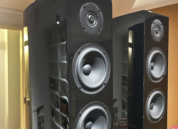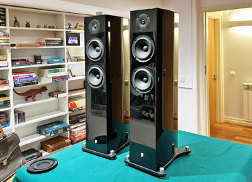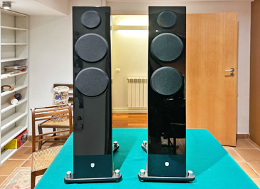 The PM-6 are a 2 ½-way speaker system covered by a almost retro-style anti-dust grill, one for each driver. The elegant curvature of the enclosure is more than a design affectation. The specific geometry of the cabinet eliminates internal standing waves, because reflections between boundaries are never in synchronism. The metal base is beautiful and stable with its four adjustable earthquake-proof feet that allow a perfect isolation from the floor and a great absorption from spurious vibrations. The speakers slants backwards with an angle of 2,5 degrees to ensure that the emanations of the three drivers joint together in temporal phase, in correspondence with the suggested listening position. Specifications: Frequency response: 34Hz-25kHz -6dB. Sensitivity (2,83V): 90dB. Recommended power amplifier: 50 to 300W. Nominal impedance: 4ohm. Connectors: Gold plated 4mm Plugs, bi-wire. Drivers: High frequencies: 38mm Ring Radiator, powerful ferrite motor and optimised chamber. Mid & Low frequencies: 170mm paper cone, low loss suspension, motor with shorting rings and optimised voice coil. Low frequencies: 170mm paper cone, low loss suspension, motor with shorting rings.