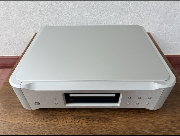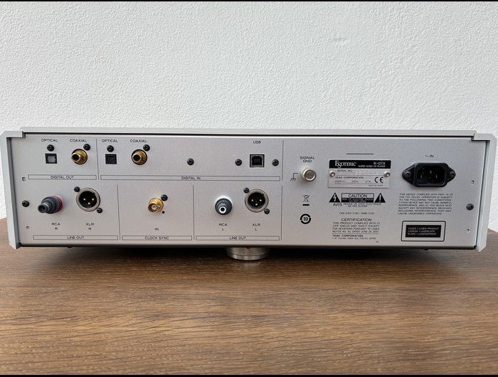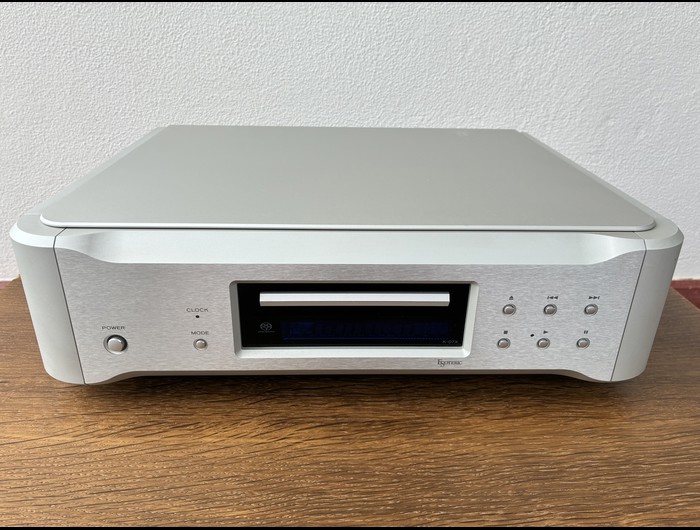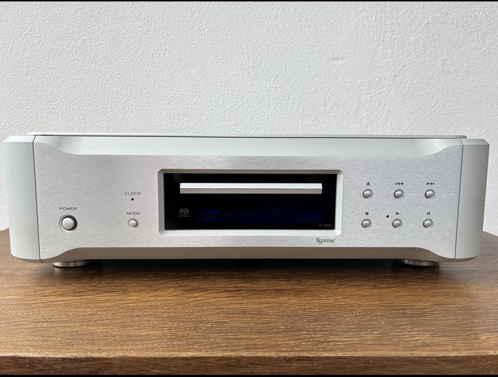 Esoteric K-07x Super Audio CD/CD Player. Features: VOSP* (Vertically aligned Optical Stability Platform) mechanism with Axial Sliding Pickup, the same used in the Grandioso line of high-end SACD players. Asahi Kasei’s AK4490 32-bit DAC in a discrete dual-mono configuration with “four parallel/differential circuits and eight outputs driving each channel. EDLC (Electronic Double-Layer Capacitors) in the power supply. 34-bit D/A processing algorithm with an encoding resolution that is an astounding 1,024 times greater than that of 24-bit encoding. Proprietary Esoteric-HCLD* Type 2 Current - Enhancing Output Buffer Circuit. External Clock Sync Function. Comprehensive D/D Conversion Compatible With Wide Range of Sources - In addition to playback at the original sampling frequency, 2X, 4X and 8X up-conversion of the PCM digital signal is also provided. Four Digital Filters for PCM signal processing Plus Filter OFF Mode - two FIR (Finite Impulse Response) and two types of short delay. A Digital Filter OFF mode permits both PCM and DSD digital filters to be bypassed if desired. Digital inputs support 2.8MHz DSD and up to 192kHz/24-bit high-resolution PCM. There is also USB support for 2.8/5.6/11.2MHz DSD, 32/384 PCM, and Asynchronous Transmission Mode. Remarks: One small scratch on the left side panel, one mark on the rear panel, one small dent on the right corner of the front panel, and three minor marks on the top panel.