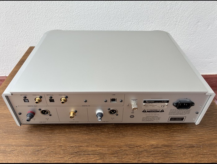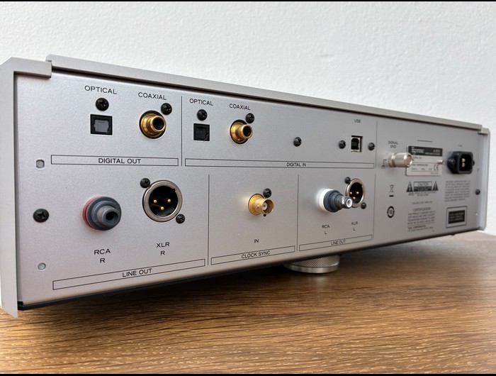 Specifications: (2) Analog audio outputs: 1 x XLR and 1 x RCA. Output impedance: XLR: 20 Ω, RCA: 20 Ω. Maximum output level (at 1kHz, 10kΩ load): XLR: 5.0 Vrms, RCA: 2.5 Vrms. When Super Audio CD, XLR output: Frequency response - 5 Hz to 70 kHz (−3 dB), S/N ratio: 117 dB, Distortion: .0.0007% (1 kHz). (3) Digital audio input: 1 x RCA (input impedance: 75 Ω, 0.5 Vp-p), 1 x Optical:−24.0 to −14.5dBm peak. USB-B connector: USB2.0 standard. (3) Digital audio output: 1 x RCA (0.5 Vp-p, 75 Ω), 1 x optical (−21 to −15 dBm peak), and USB-B connector: USB 2.0 standard. Clock sync input: Connector: BNC. Supported input frequencies (±15 ppm): 44.1 kHz, 48 kHz, 88.2 kHz, 96 kHz, 176.4 kHz, 192 kHz, 10 MHz, 22.5792 MHz, 24.576 MHz. Input impedance: 75 Ohm. Input level: Rectangle wave: equivalent to TTL levels, Sine wave: 0.5 to 1.0 Vrms (50 to 75 Ω).