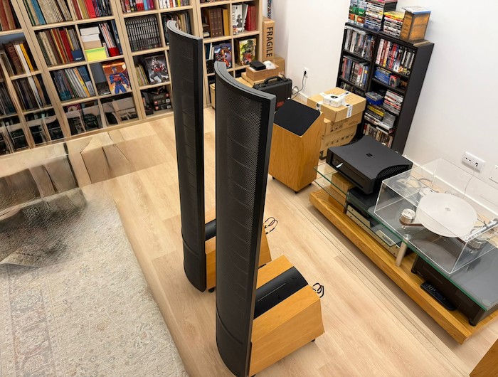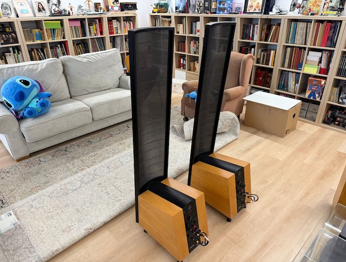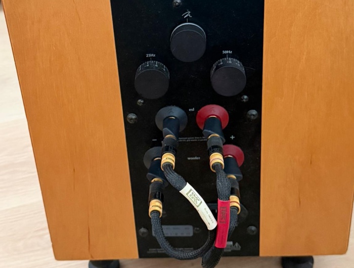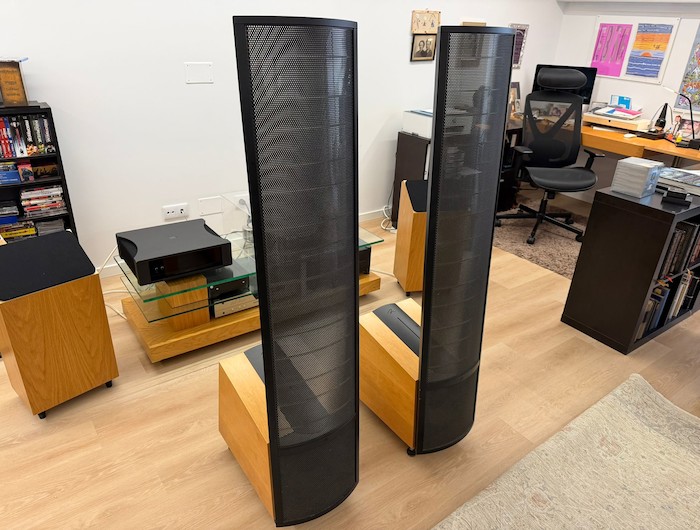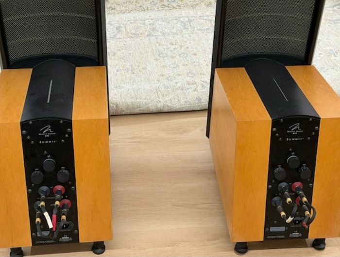 Specifications: Frequency Response: 24Hz to 23kHz (±3dB). Horizontal Dispersion: 30 degrees. Vertical Dispersion: 44-inch (111cm) line source. Sensitivity: 92dB/W/m. Impedance: 4 ohms nominal, minimum 0.7 Ohms @ 20kHz. Crossover Frequency: 270Hz. Components: Custom-wound audio transformer, air core coils, polypropylene capacitors. Woofer: Two x 10” (25.4 cm) (per channel), cast basket, high excursion, aluminum cone with extended throw driver assembly, non-resonant chamber format. Woofer Amp Power: 2 x 200 watts/channel (4 ohms). Bass Controls: ±10dB at 25Hz & 50Hz. Power Handling: 100-300 Watts/channel. Signal Inputs: Custom bi-wire binding posts. Mains Power Draw: Idle: 20W each, Max: 350W each. Other: Light intensity dimmer control.